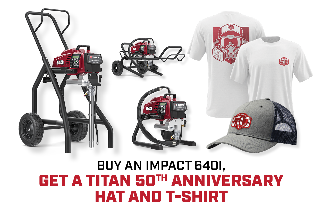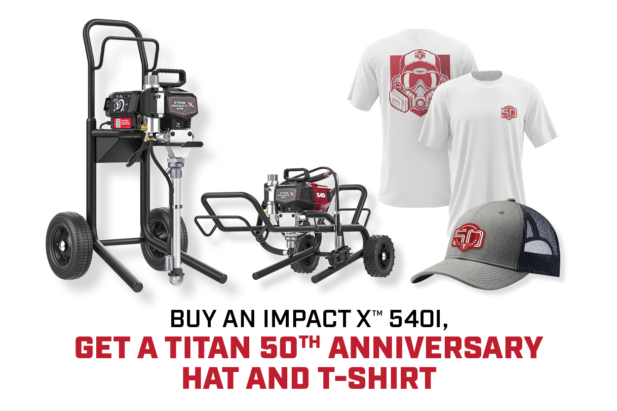 From the jobsite to the industry as a whole, Titan’s Impact® Series has defined what pros expect from an airless sprayer. Today, the X540I, 640I, and 640IA take that standard to the next level with smarter controls, connected technology, and real-time management tools that keep professionals spraying strong. For 50 years, Titan has innovated with pros in mind—and for the month of October, that innovation comes with exclusive anniversary gear.